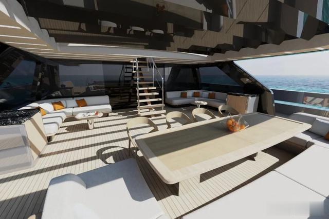 “飞马”号的一大亮点是其开放式尾甲板,配有可折叠的舷墙,旨在打造亲水体验。展开的侧甲板平台可转换为配备躺椅、日光浴垫及用餐区的广阔休闲空间。主甲板内部设全景沙龙,嵌入式落地门实现实现内外无缝衔接。内外双楼梯可便捷连通飞桥,这里还配备了一个时尚的休息区,或许是欣赏美景的理想之地。